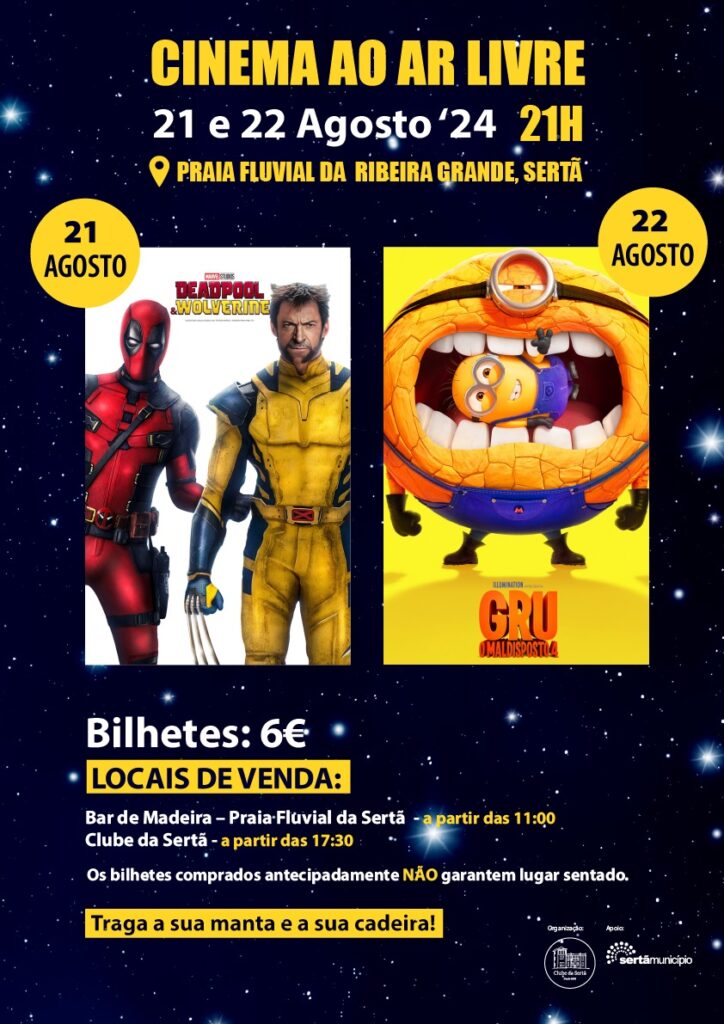 A Praia Fluvial da Ribeira Grande, na Sertã, vai acolher sessões de cinema ao ar livre a 21 e 22 de agosto, às 21 horas. Em exibição estarão os filmes “Deadpool & Wolverine”, a 21 de agosto (quarta-feira) e “Gru, o Maldisposto 4”, no dia 22 de agosto (quinta-feira). Promovida pelo Clube da Sertã, a iniciativa conta com o apoio do Município da Sertã.