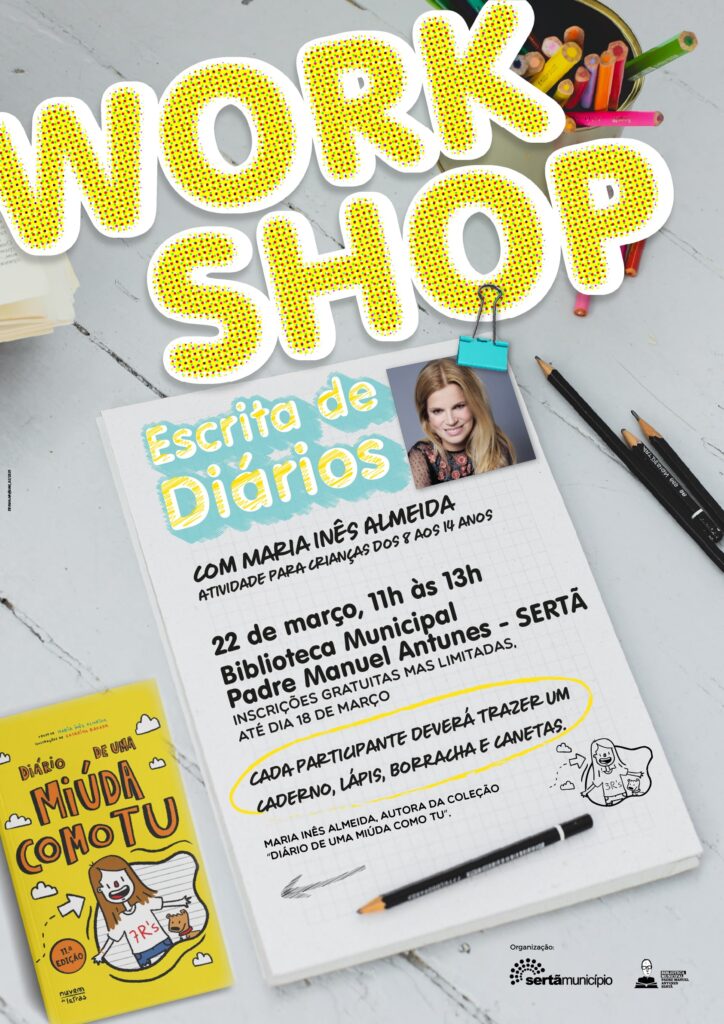 Maria Inês Almeida, autora da famosa coleção “Diário de uma miúda como tu”, vem à Biblioteca Municipal Padre Manuel Antunes, Sertã, para um workshop de Escrita de Diários. Dirigido ao público juvenil dos 8 aos 14 anos, este workshop acontece a 22 de março, das 11 às 13 horas. Esta iniciativa irá desafiar os participantes a dar largas à sua imaginação e a preencher as primeiras folhas em branco dos seus diários, (re)descobrindo a magia da escrita e não só.