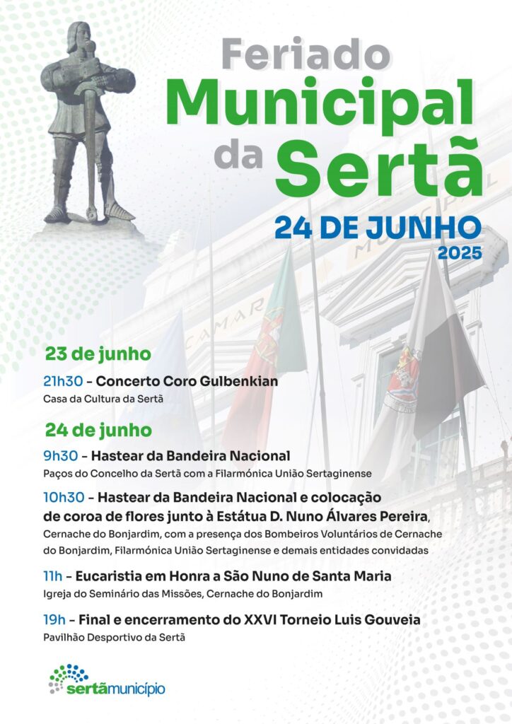 Já no dia 24 de junho, Feriado Municipal, as comemorações iniciam-se às 9h30m junto à Câmara Municipal da Sertã, para a cerimónia do Hastear da Bandeira Nacional, acompanhado pela Filarmónica União Sertaginense (FUS). Segue-se às 10h30 o Hastear da Bandeira Nacional e deposição de Coroa de Flores junto à estatura de D. Nuno Álvares Pereira, em Cernache do Bonjardim, com a presença dos Bombeiros Voluntários de Cernache do Bonjardim, da FUS e demais entidades convidadas. O programa prossegue às 11 horas com a eucaristia em honra a São Nuno de Santa Maria, no Seminário das Missões, em Cernache do Bonjardim.