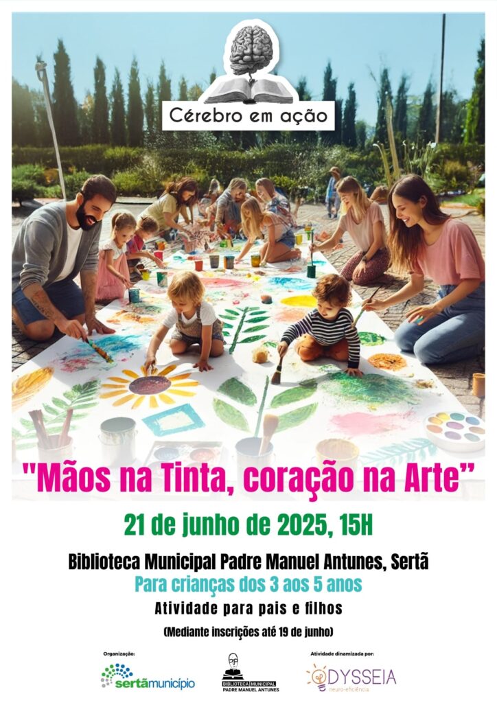 A Biblioteca Municipal Padre Manuel Antunes, na Sertã, recebe no próximo dia 21 de junho, às 15 horas, uma nova sessão da iniciativa Cérebro em Ação, com a atividade “Mãos na Tinta, corações na Arte”, dirigida a pais e filhos dos 3 aos 5 anos.