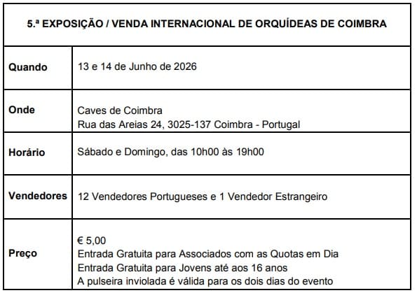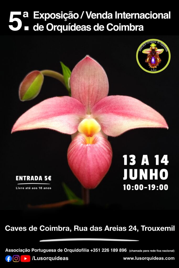 Nos dias 13 e 14 de junho, Coimbra volta a afirmar-se como um dos grandes pontos de encontro da orquidofilia em Portugal com a realização da 5.ª Exposição / Venda Internacional de Orquídeas de Coimbra, organizada pela A.P.O. – Associação Portuguesa de Orquidofilia. Nesta edição, o evento realiza-se pela primeira vez nas Caves de Coimbra, na Rua das Areias 24, Trouxemil, um novo espaço que reúne condições particularmente atrativas para expositores, colecionadores e público em geral.