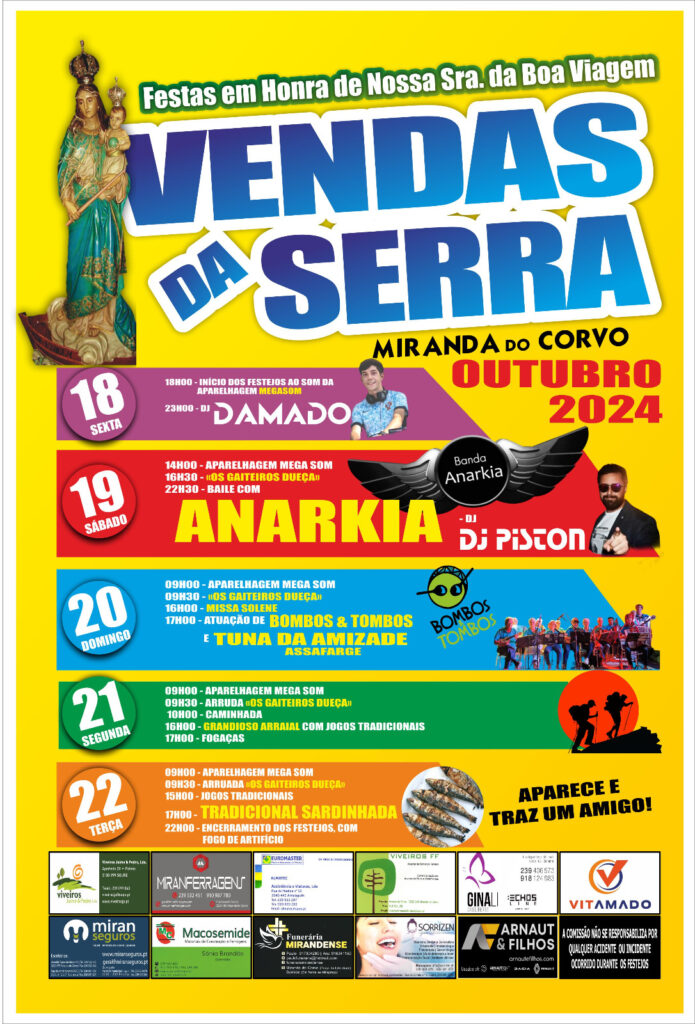 Início/Miranda do Corvo/Festas em honra de Nossa Senhora da Boa Viagem decorrem em Vendas da Serra, Miranda do Corvo de 18 a 22 de outubro Festas em honra de Nossa Senhora da Boa Viagem decorrem em Vendas da Serra, Miranda do Corvo de 18 a 22 de outubro