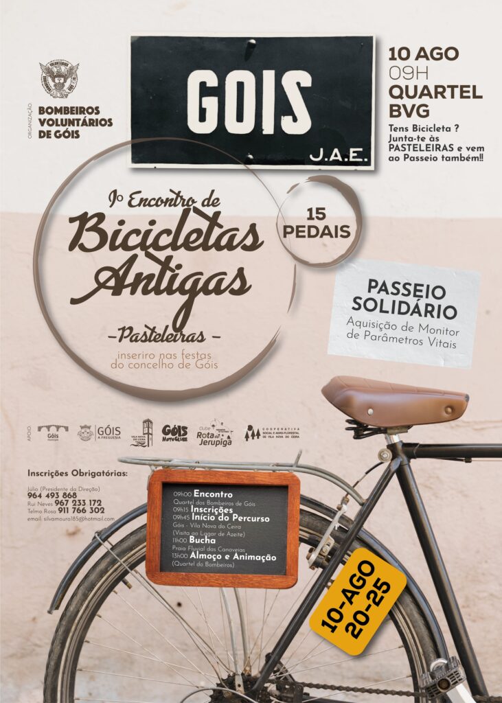 No âmbito da programação das Festas do Concelho de Góis, no dia 10 de agosto, pelas 09h00, com início no Quartel dos Bombeiros Voluntários de Góis, irá decorrer o 1º Encontro de Bicicletas Antigas e Pasteleiras, uma iniciativa solidária promovida pelos Bombeiros Voluntários de Góis, em parceria com o Município de Góis, com o objetivo de adquirir um monitor de parâmetros vitais.