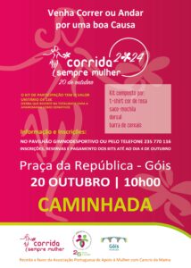 A caminhada “Corrida Sempre Mulher”, na Vila de Góis, irá realizar-se no dia 20 de Outubro, pelas 10h00, sendo o ponto de encontro no Pavilhão Gimnodesportivo de Góis. O Kit de participação tem o valor unitário de 13€, valor que reverte na totalidade para a APAMCMama, como donativo.