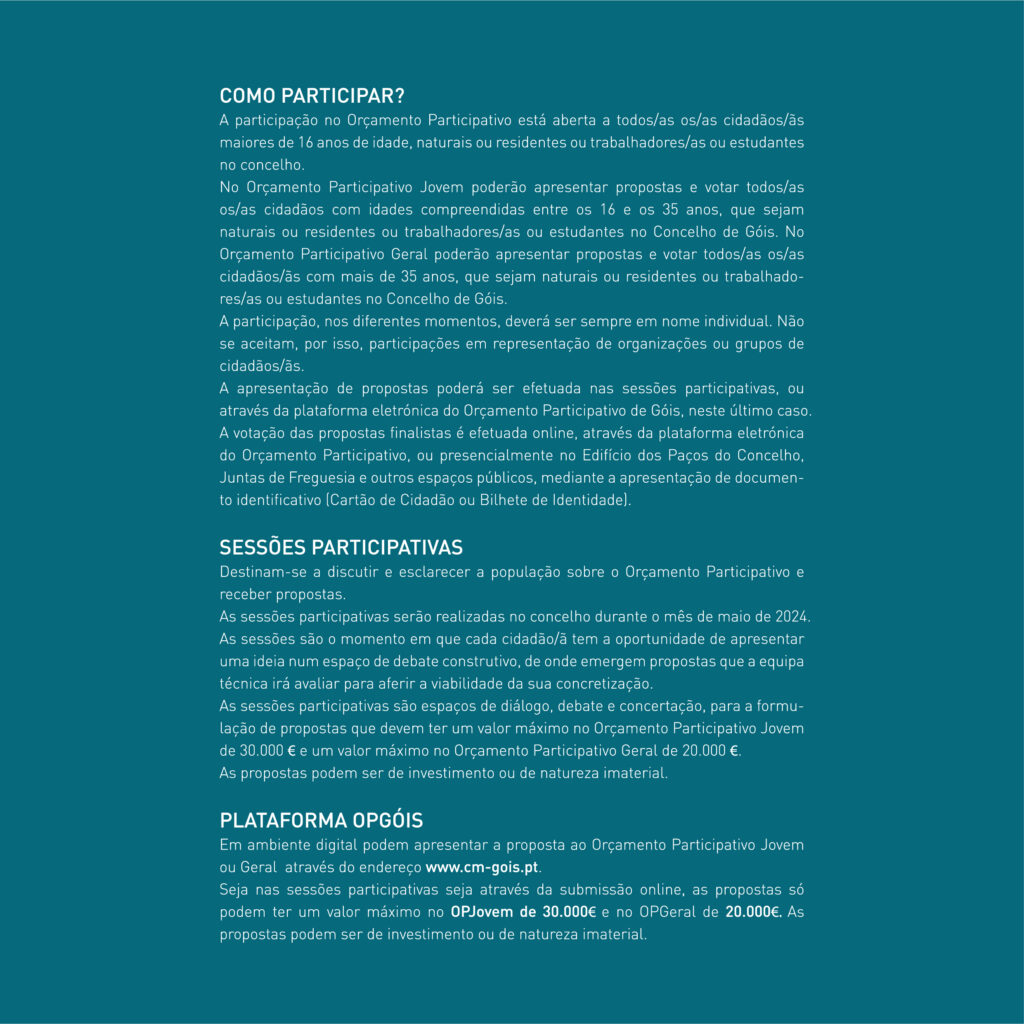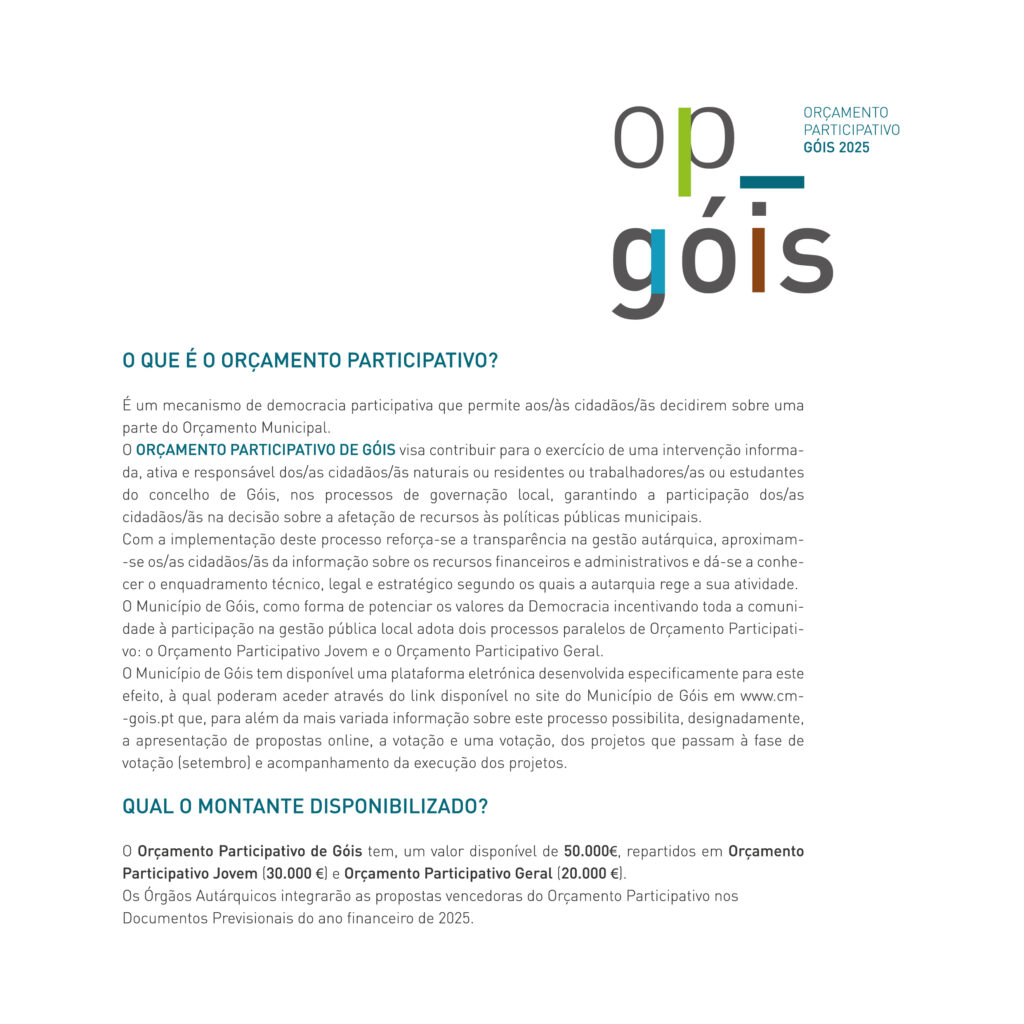 Os/as cidadãos/ãs a partir dos 35 anos, que sejam naturais, residentes, trabalhadores/as ou estudantes do Concelho de Góis, podem concorrer com a sua proposta de investimento no Orçamento Participativo Geral, assegurando a sua participação com ideias e projetos, contribuindo para um concelho mais dinâmico, mais resiliente e mais capacitado.