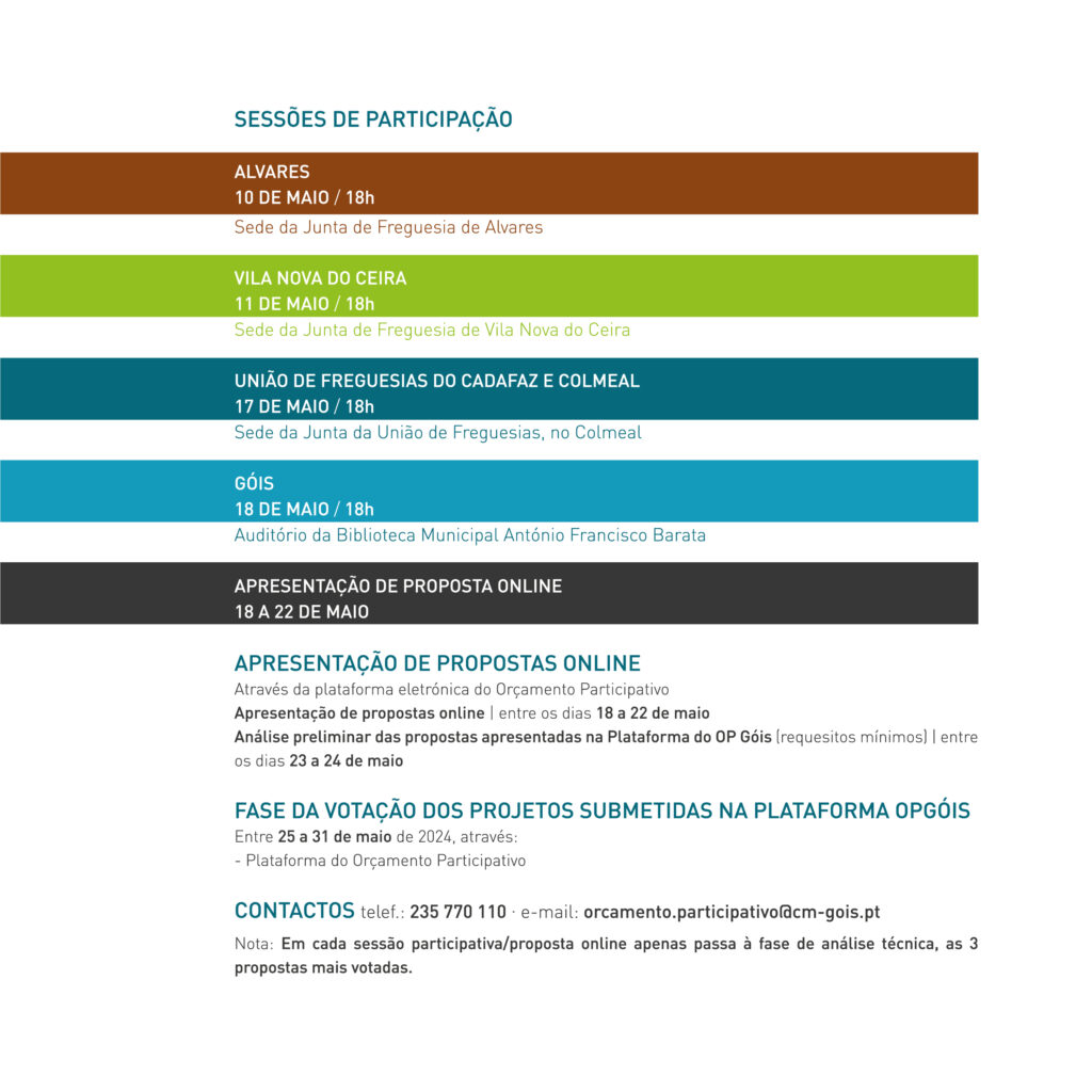 Remete-se em anexo a divulgação das sessões participativas, bem como flyer informativo sobre o Orçamento Participativo de Góis 2025.