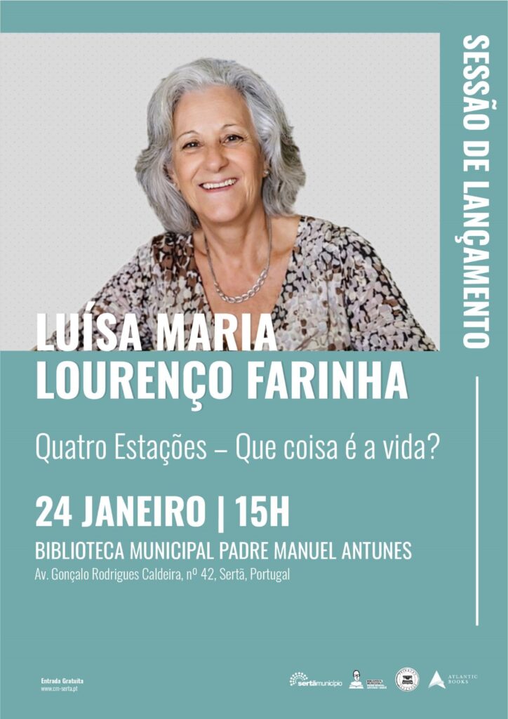 Luísa Maria Lourenço Farinha apresenta, no próximo dia 24 de janeiro, o seu mais recente livro “Quatro Estações – Que coisa é a vida?”, na Biblioteca Municipal Padre Manuel Antunes, na Sertã, a partir das 15h. A entrada é livre.