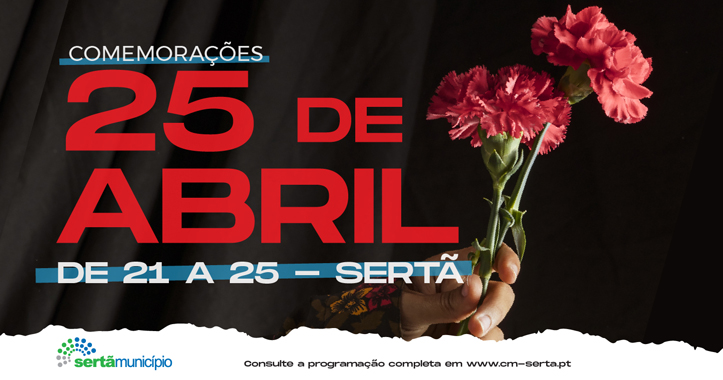 De 21 a 25 de abril o Município da Sertã vai celebrar o 25 de Abril com um programa evocativo. As comemorações iniciam-se a 21 de abril, às 16h45m, no Edifício dos Paços do Concelho com a Apresentação Musical “25 de Abril pelo Grupo Coral do Sertanense” com direcção artística do Maestro Paulo Reis.