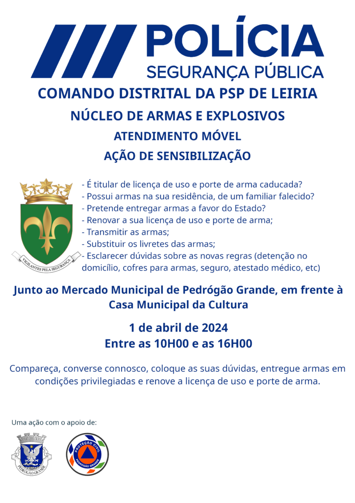 O Comando Distrital de Leiria da PSP, informa que, no dia 01 de abril de 2024, entre as 10H00 e as 16H00, uma Brigada do Núcleo de Armas e Explosivos deste Comando irá deslocar-se ao Município de Pedrógão Grande para fazer atendimento móvel no âmbito das armas e seus licenciamentos.
