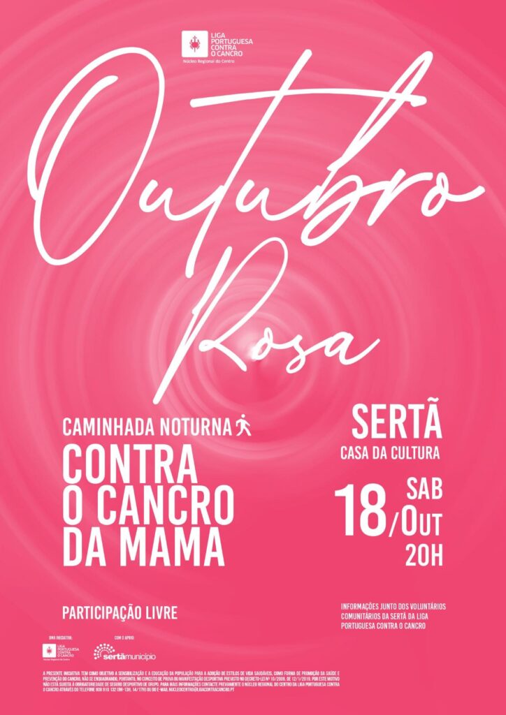 Dia 18 de outubro, sábado, há caminhada contra o cancro da mama na Sertã. A concentração dos participantes será às 20 horas, em frente à Casa da Cultura da Sertã, e o passeio decorrerá junto à margem da Ribeira da Sertã.