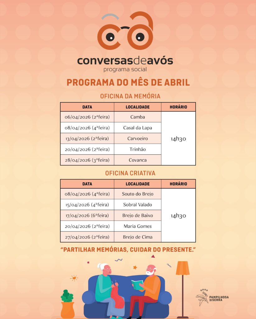 O programa “Conversas de Avós” continua, durante o mês de abril, a percorrer várias localidades do concelho de Pampilhosa da Serra, promovendo, em dez aldeias distintas, outros tantos momentos de partilha, escuta ativa e valorização da experiência sénior.