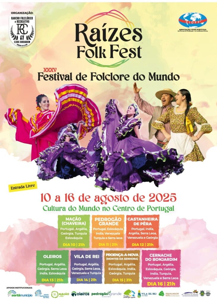 O auditório da União de Freguesias de Cernache do Bonjardim, Nesperal e Palhais será palco, na próxima sexta-feira, 25 de julho, às 18h30, da apresentação oficial da edição de 2025 do Raízes Folk Fest – Festival de Folclore do Mundo, um evento que se vem a afirmar como um verdadeiro ponto de encontro de culturas e tradições oriundas de quatro continentes.