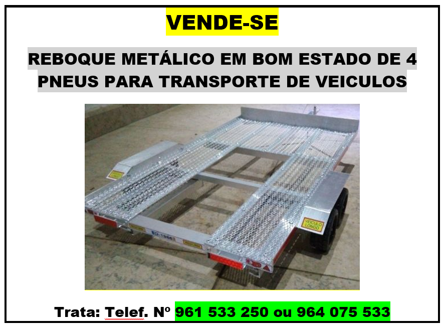 Início/PUBLICIDADE/REBOQUE METÁLICO EM BOM ESTADO DE 4 PNEUS PARA TRANSPORTE DE VEICULOS REBOQUE METÁLICO EM BOM ESTADO DE 4 PNEUS PARA TRANSPORTE DE VEICULOS (Chamada para a rede móvel nacional)