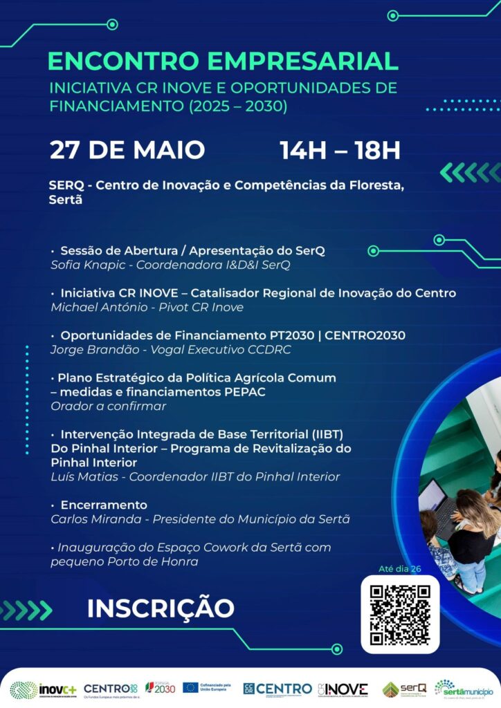 financiamento disponíveis para o período 2025-2030. O encontro decorre das 14 às 18 horas, apresentando um painel de oradores diversificado. Após a Sessão de Abertura, pela coordenadora de I&D&I do SerQ, Sofia Knapic, Michael António irá apresentar o “CR Inove – Catalisador Regional de Inovação do Centro, uma iniciativa promovida pela CCDRC (Comissão de Coordenação e Desenvolvimento Regional do Centro)”. Segue-se Jorge Brandão, Vogal Executivo da CCDRC, que irá abordar as “Oportunidades de Financiamento PT2030 | CENTRO2030”, e logo depois, é apresentado o “Plano Estratégico da Política Agrícola Comum – medidas e financiamentos PEPAC”. O último painel do dia é dedicado à “Intervenção Integrada de Base Territorial (IIBT) do Pinhal Interior”, onde Luís Matias, coordenador deste projeto, apresentará o “Programa de Revitalização do Pinhal Interior”. O encerramento deste encontro será feito por Carlos Miranda, presidente da Câmara Municipal da Sertã.