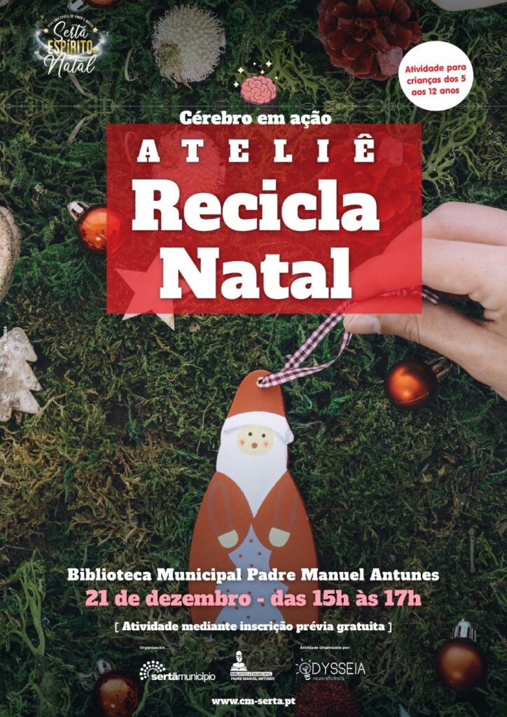 A última sessão do ano da iniciativa “Cérebro em Ação” traz como proposta um Ateliê Recicla Natal, no dia 21 de dezembro, às 15 horas. Nesta sessão, dedicada a pais e filhos, o espírito natalício vai estar muito presente, trazendo como proposta a criação de enfeites de Natal com recurso a materiais recicláveis.