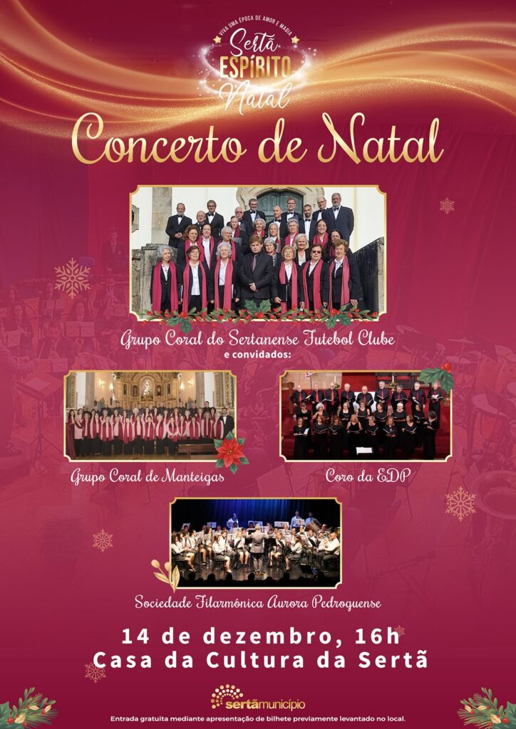A entrada no Concerto do Grupo Coral do Sertanense e convidados é gratuita mediante apresentação de bilhete previamente levantado na Casa da Cultura da Sertã. Consulte o programa completo da iniciativa Sertã Espírito de Natal em cm-serta.pt.