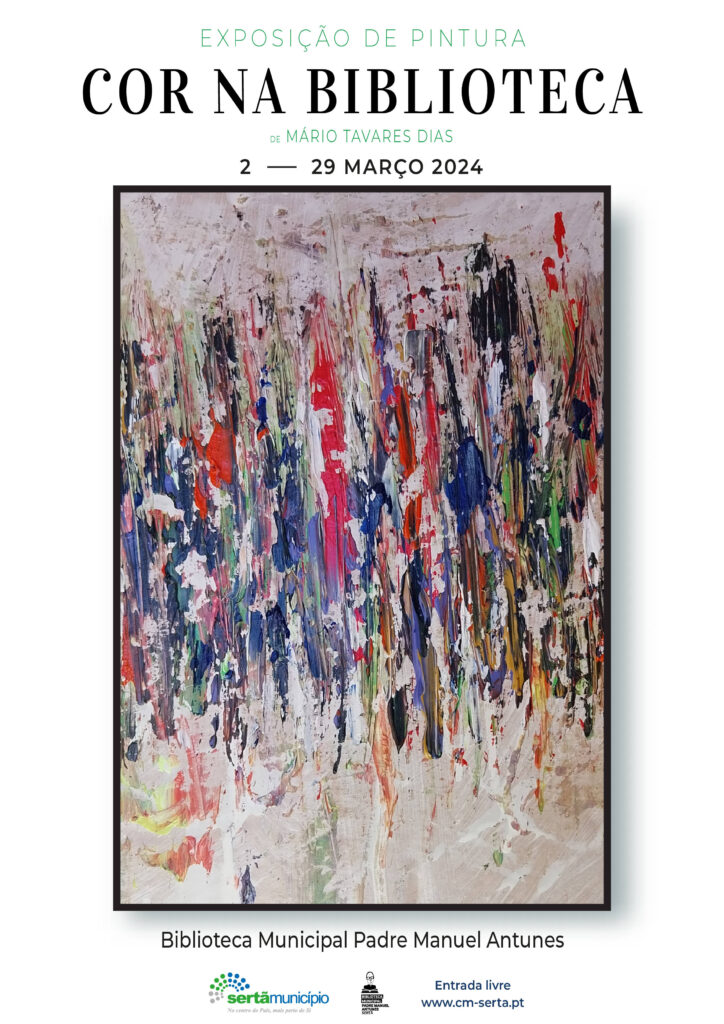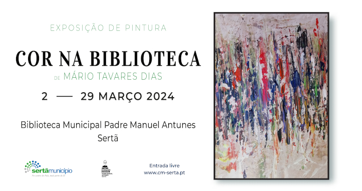 A partir de 2 de março, a Biblioteca Municipal Padre Manuel Antunes, na Sertã, terá patente a exposição de pintura “Cor na Biblioteca”, da autoria de Mário Tavares Dias, que apresenta um conjunto de obras de cariz abstrato.
