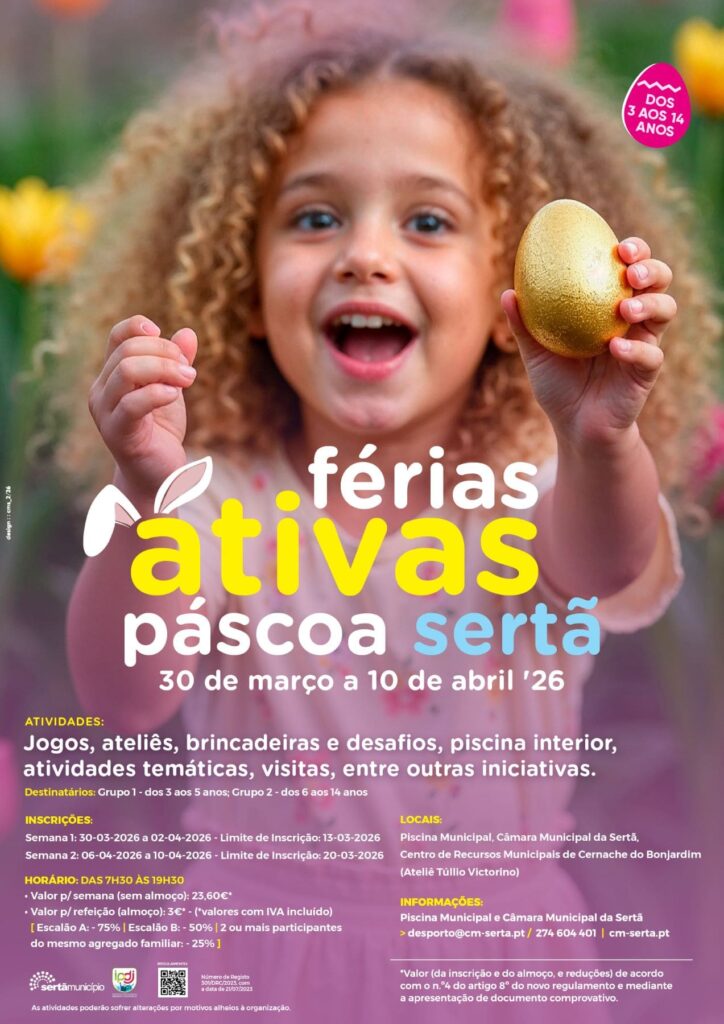 De 30 de março a 10 de abril, as escolas fazem a habitual pausa letiva para as férias da Páscoa. Para apoiar as famílias nesta interrupção letiva, estão de regresso as “Férias Ativas”, programa dinamizado pelo Município da Sertã com atividades para crianças dos 3 aos 14 anos. As inscrições estão já a decorrer.