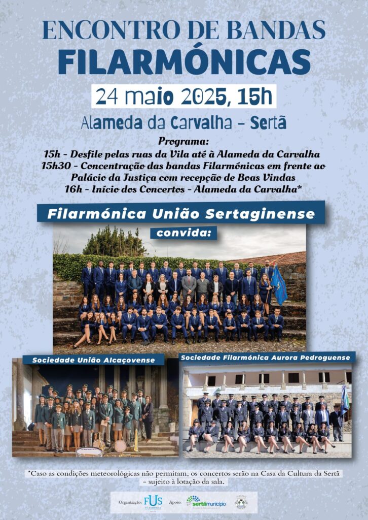 Dia 24 de maio, a Sertã recebe o Encontro de Bandas Filarmónicas, organizado pela Filarmónica União Sertaginense (FUS). À banda anfitriã junta-se a Sociedade Filarmónica Aurora Pedroguense, de Pedrógão Pequeno, e a Sociedade União Alcaçovense, de Alcáçovas (Viana do Alentejo), juntando “em palco” três instituições centenárias que vivem em prol da música.
