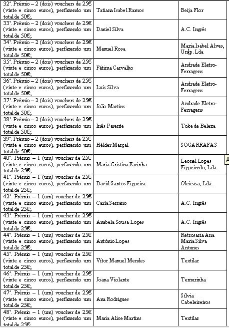 O sorteio dos 50 vencedores do “Natal no Comércio Tradicional” aconteceu na Casa da Cultura da Sertã, pelas 10 horas do dia 7 de janeiro, e contou com a presença de Samuel Xavier, Chefe do Gabinete de Apoio à Presidência, Joana Pereira, da Associação de Produtores do Concelho da Sertã (AProSer) e dois agentes da Guarda Nacional Republicana. Confira abaixo, os vencedores deste ano.
