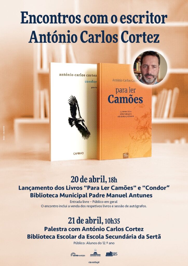 Inicialmente agendado para os dias 13 e 14 de abril, o escritor António Carlos Cortez vai estar na Sertã nos dias 20 e 21 de abril, para participar em diversos momentos de celebração literária. No dia 20 de abril, às 18 horas, a Biblioteca Municipal Padre Manuel Antunes, acolhe o lançamento dos seus mais recentes livros, “Para Ler Camões” e “Condor”, numa iniciativa de entrada livre que contempla venda de livros e sessão de autógrafos.