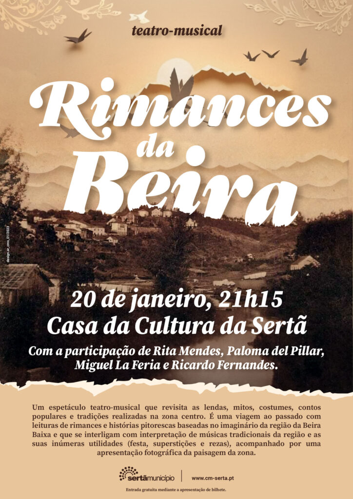A 20 de janeiro, a partir das 21h15, vai estar em cena na Casa da Cultura da Sertã o teatro-musical “Rimances da Beira”. Trata-se de um espetáculo que irá revisitar lendas, mitos, costumes, contos populares e tradições realizadas na zona centro. Vai ser uma verdadeira viagem ao passado, com leituras de rimances e histórias pitorescas baseadas no imaginário da região da Beira Baixa, interligando-se com interpretação de músicas tradicionais da região e as suas inúmeras utilidades (festa, superstições e rezas), acompanhado por uma apresentação fotográfica da paisagem da zona.